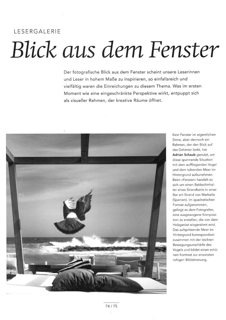 The picture “Beach Bird” was chosen as anchor picture for the reader gallery of the photo magazine “schwarzweiss” to th topic was “View from the Window”